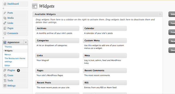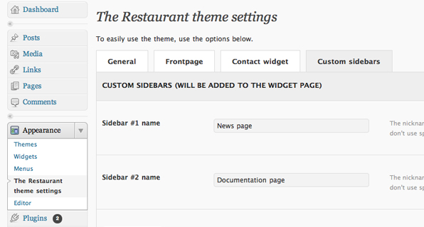 Appearance / The Restaurant themesettings / custom sidebars